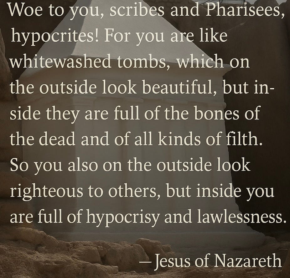 The remarkable Clarence Jordan (B.S. in agriculture, University of Georgia; Ph.D. in biblical Greek, Southern Baptist Theological Seminary) translated Matthew 23:27-28 in his Cotton Patch Gospel series (and set it in the Bible Belt during the Civil Rights era) as follows: