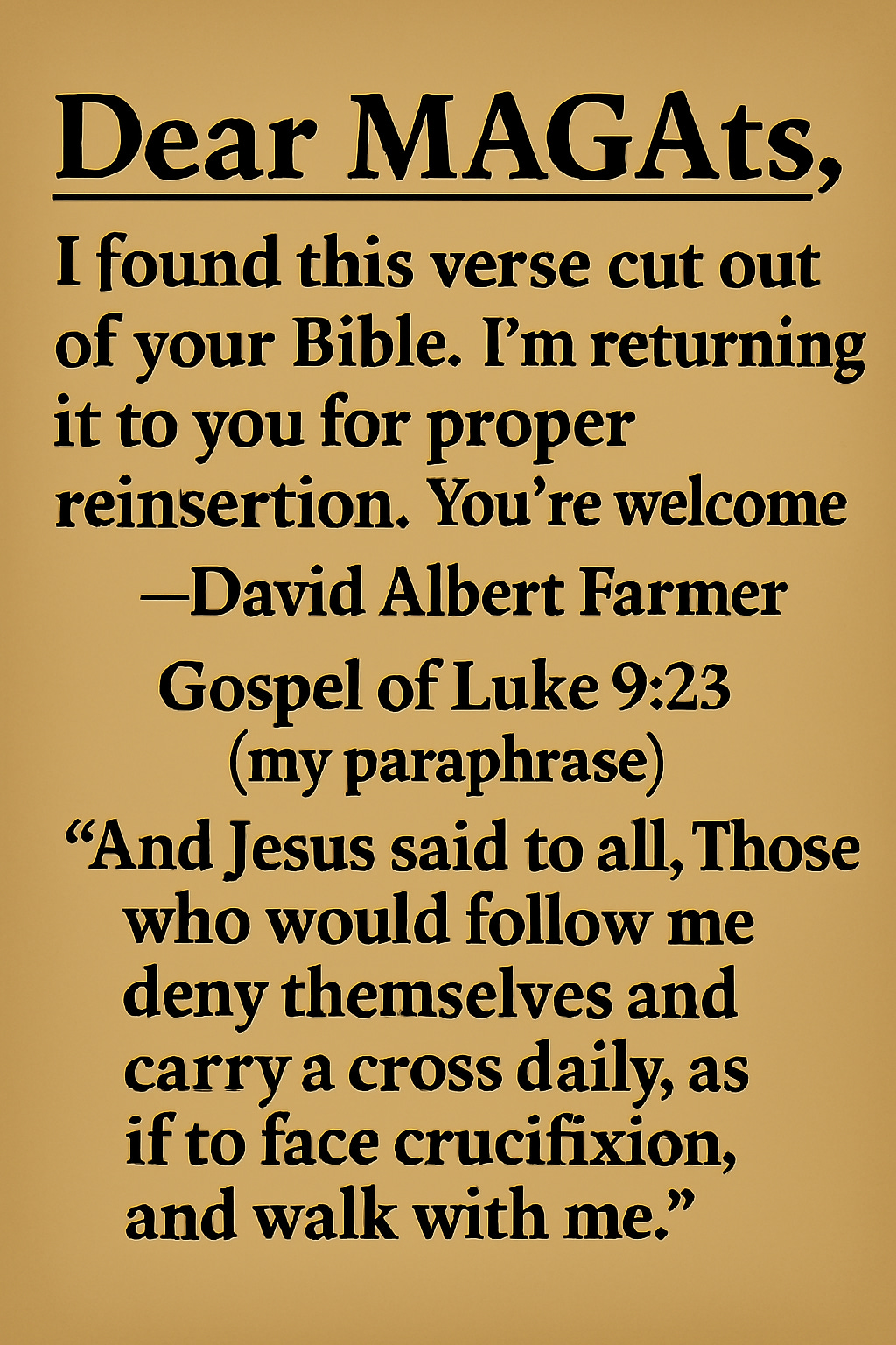 Dear MAGAts, it must be disheartening to find so many verses in your Trump Bible hidden like the DOJ redacted Epstein client list. Here’s a small assist.Luke 9:23Jul 30, 202522Share