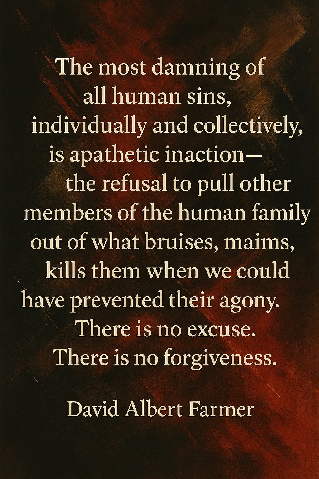 The most damning of all human sinsI stand in awe of those taking huge risks to protect, possibly save, victims of evil. David Albert FarmerOct 12, 202551Share