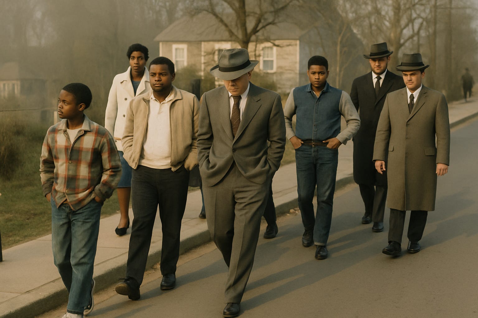 AI re-creation of the group walking.to school. Rev. Turner is in the front right.