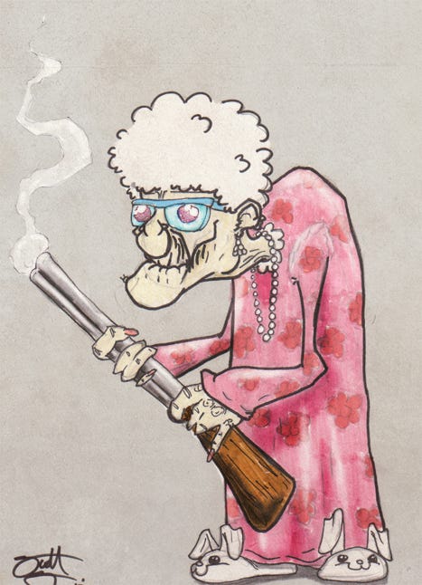 See that sweet old lady sitting shotgun in the first truck there? She’s not just sitting shotgun. Yep. She’s got one. Granny’s got bad knees, but her eyesight’s 20/20 with glasses. In the 70-plus years she’s been shooting, not once—seriously, not one time—has she missed her target. It’s a gift.